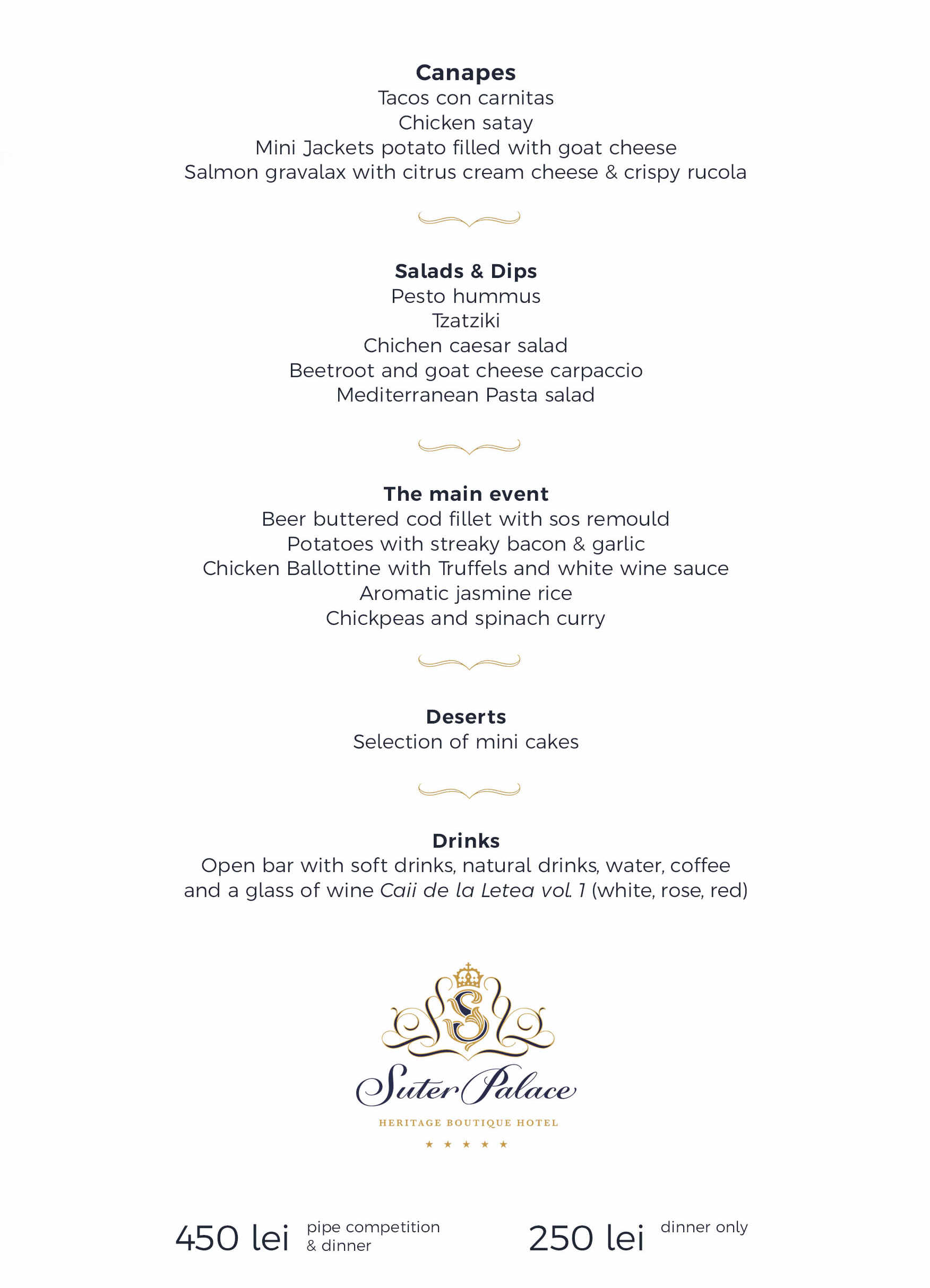 - participare la cina festivă (pentru însoțitorii neparticipanți la competiție): 250 lei