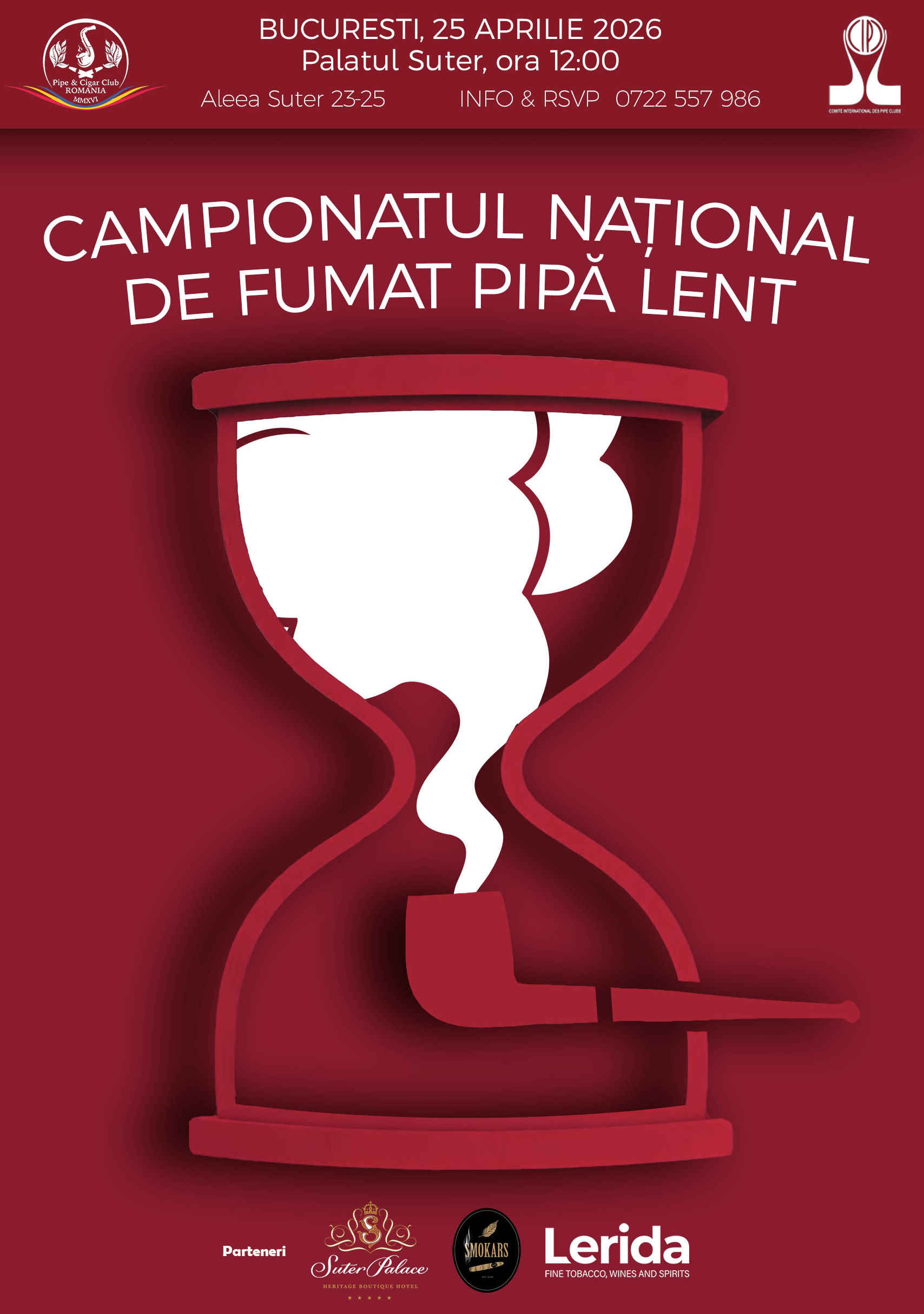 Pipe & Cigar Club Romania are plăcerea să vă invite să participați la Campionatul Național de fumat pipă lent, ce se va desfășura sâmbătă, 25 aprilie 2026 în București, la Palatul Suter (Aleea Suter 23-25), începând cu ora 12:00.